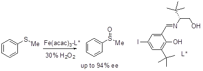 The oxidation of aryl alkyl sulfides has been accomplished using in situ generated Fe(III)-Schiff base complex in the presence of 30% H2 O2 as terminal oxidant (Scheme 8). Addition of benzoic acid as an additive enhances the enantioselectivity significantly.