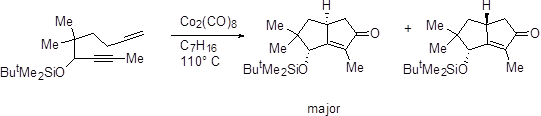 The reaction is completely regioselective with respect to the alkyne. The larger substituents always occupy the position adjacent to the carbonyl group in the product. However, the use of an unsymmetrical alkene usually leads to a mixture of regioisomers (Scheme 6).