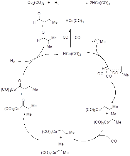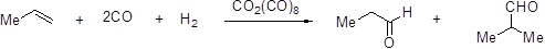 One of the most industrially important reactions using cobalt is definitely the hydroformylation. This reaction catalyzed by dicobalt octacarbonyl. This reaction inserts a carbonyl group in an alkene thereby giving rise to aldehydes (Scheme 8). It is also known as the oxo process.