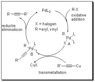 Oxidative addition of Pd(0) with aryl halide gives Pd(II) intermediate A that undergoes reaction with in situ generated alkynyl copper to give intermediate B. The latter complete the catalytic cycle by the reductive elimination of the substituted alkyne (Scheme 14).