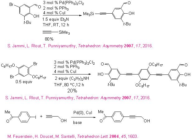 The reaction involves the coupling aryl halides with alkynes using the combination of palladium and copper catalysts in the presence of base at moderate temperature (Scheme 13). It is compatible with functional groups such as hydroxo, carbonyl, amino, acyloxy, acetal, esters and amides, and finds extensive applications in organic synthesis.