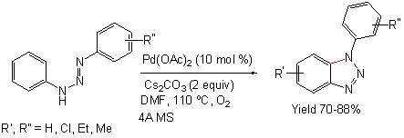 Palladium-based catalysts have been explored for carbon-heteroatom bond formation via cross-coupling as well as C-H activation. For example, the synthesis of 1-aryl-1H-benzotrizole can be accomplished from triazene via C-H activation using Pd(OAc) 2 under aerobic conditions (Scheme 16).