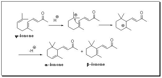 Dienes may undergo acid-catalyzed cyclizations provided the product is a stereochemically favored five or six membered ring. For example, in the presence of acid, ψ-ionone cyclizes to give a mixture of α - and β -ionones.