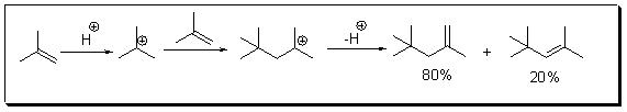 Alkenes undergo protonation with acid to give a carbocation that can add with second molecule of alkene to generate new carbocation which could eliminate a proton to give alkene. For an example, isobutylene with 60% sulfuric acid affords a 4:1 mixture of 2,4,4-trimethyl-1-pentene and 2,4,4-trimethyl-2-pentene. The reaction takes place by protonation of one molecule of the alkene to provide a carbocation that adds to the methylene group (Markonovkov's rule) of a second molecule. The new carbocation eliminates a proton to afford the products.