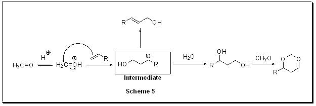 Aliphatic alkenes undergo Prins reaction. For example, the reaction of propene, HCHO and HCl gives 4-chloro-tetrahydropyran in good yield (Scheme 6).