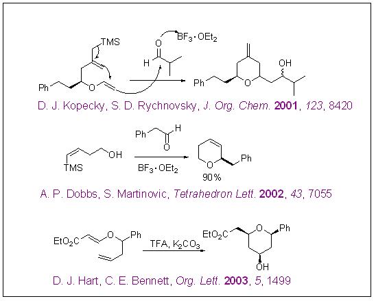 Diastereoselective version of this reaction has also been considerably explored. For example , the synthesis of highly substituted 4-hydroxytetrahydropyran can be accomplished using rhenium(VII) complex, O3 ReOSiPh3 , as a catalyst under milder conditions (Scheme 7).