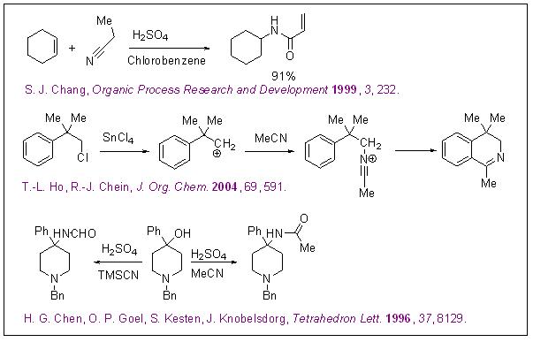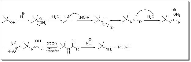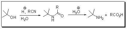 tertiary carbocation is formed which is attacked by the nitrile to give a quaternary ion. The latter is decomposed by water to provide an amide which, in acidic conditions, is hydrolyzed to give an amine (Scheme 1).
