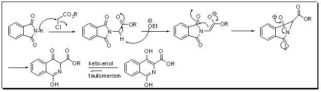 Potassium phthalimide proceeds nucleophilic substitution with α -halo acetate and the resulting product in the presence of base undergoes rearrangement to afford isoquinoline derivatives (Scheme 3).