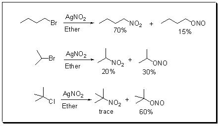 Metal nitrites can react with alkyl halides at both nitrogen and oxygen to give nitro compounds and nitrites, respectively, whose proportions depend on the structure of the reactants and reaction conditions. For example, silver nitrite suspended in ether reacts with alkyl halides to give a mixture of nitro-compounds and nitrites whose proportions depend on the nature of alkyl halides (Scheme 4).