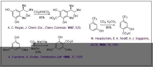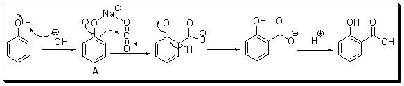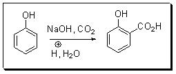 Phenoxide ions react with CO2(weak electrophile) under pressure at about 100°C to give ortho substitution.