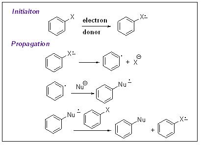 The initiation of the reaction is generally either by solvated electron (sodium in liquid ammonia) or with photochemical excitation in that the nucleophile is the electron donar. For examples,