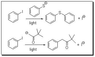Unactivated aryl halides proceed nucleophilic substitution with typically enolates, amide ion and thiol anion via a chain reaction involving anion radicals in that the initiation step is an electron transfer. The first two steps are similar to those in SN1 reaction which led to the designation SRNI (R for radical).