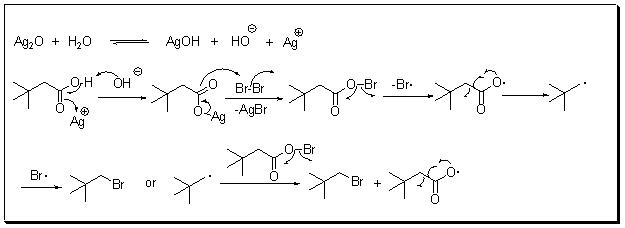 The reaction involves the formation of acyl hypobromite and its homolytic cleavage to give acyloxy radical which loses CO2 and the resulting radical reacts with bromine radical or abstracts bromine from a second molecule of the hypobromite.