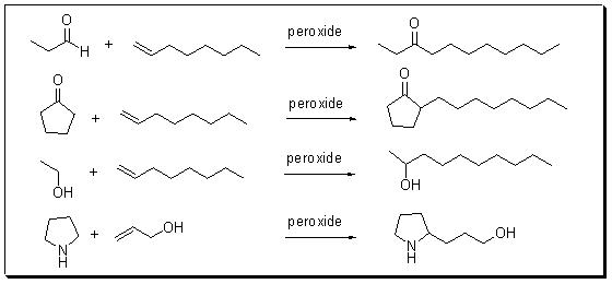 The following are some examples for radical addition to carbon-carbon double bond with a variety of types of starting material.