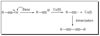 Copper(II) complex catalyzes the coupling of acetylene and monosubstituted acetylenes to yield diynes in the presence of base such as pyridine. The reaction probably takes place via one-electron oxidation of the acetylide anion by copper(II) ion followed by dimerization of the resulting acetylide radicals: