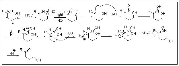 Photolysis of organic nitrites gives oxy-radical which abstracts hydrogen from a δ-CH bond. The resulting alkyl radical reacts with nitric oxide liberated during the photolysis to yield a nitroso- derivative which tautomerizes to oxime that can be hydrolyzed to carbonyl group.