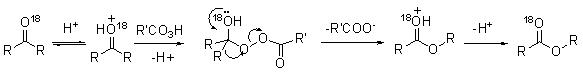 The first step involves protonation of carbonyl oxygen (Scheme 12). The addition of peracid to the protonated carbonyl group gives a tetrahedral intermediate. Elimination of the carboxylate anion and migration of R to the electron deficient oxygen atom occur simultaneously. The resulting protonated form of the ester loses a proton to yield ester. It is believed that the loss of carboxylate anion and migration of R are concerted. The labeling study with O18 suggests that the carbonyl oxygen of the ketones becomes the carbonyl oxygen of the ester.