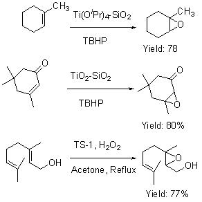 In addition to these homogeneous processes, effort has also been made to develop heterogeneous catalysts for the epoxidation of allylic alcohols with hydroperoxides (Scheme 2). TiO2-SiO2 has been found to be superior to V2O5-SiO2 and MoO3-SiO2 for this purpose. Both TBHP and H2O2 (aqueous and urea H2O2) have been employed as terminal oxidant. These systems also work for the epoxidation of unfunctionalized alkenes.