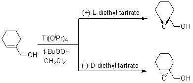 The mnemonic rule for the absolute configuration of the epoxy alcohol is as follows, if the CH2OH group is in lower right or upper left of the double bond then the epoxide is formed at the upper face of the double bond when (+)-L-diethyl tartrate is used and at lower face when (-)-D-diethyl tartrate is used (Scheme 5). The reaction works catalytically when 3Å or 4Å molecular sieves are used as an additive.