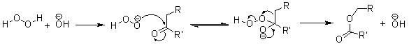 The mechanism for the alkaline hydroperoixde mediated oxidation of ketone to ester follows (Scheme 8).
