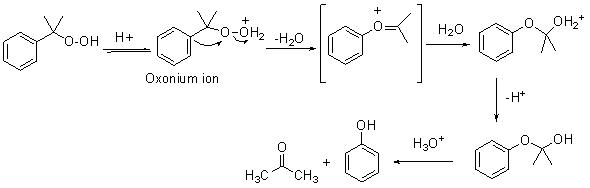 Hyderoperoxide in the presence of strong acid such as H2SO4, HClO4 and Lewis acids undergoes rearrangement as Baeyer-Villiger oxidation. For example, cumene hydroperoxide in the presence of H2SO4 undergoes rearrangement via hemiacetal to give phenol and acetone (Scheme 9). The cumene hydroperoxide can be obtained by autooxidation of cumene. This is the commercial process used for the synthesis of phenol.