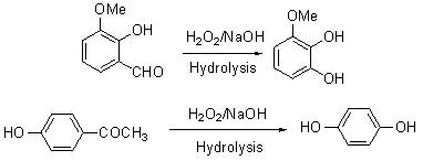 Phenolic aldehydes and ketones proceed reactions with alkaline H2O2 to replace the aldehyde or acetyl group with OH group, which is called Dakin reaction. For example, salicylaldehyde is transformed into catechol in 70% yield (Scheme 11).