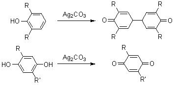 Phenols could be oxidized to a variety of products depending on the nature of substituent present in the aromatic ring. For example, 2,6-disubstituted phenols when treated with Ag2CO3 undergoes dimerization to provide diphenoquinones, while substituted 1,4-catecols are oxidized to give substituted benzoquinones (Scheme 3).