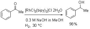 Hydrognation of carbonyls of aldehydes, ketones and esters have been well developed with chiral metal complexes in the presence of molecular hydrogen. For example, rhodium complexes with molecular hydrogen have shown good catalytic activity towards to the reduction of ketonic substrates possessing no functionality adjacent to the carbonyl group (Scheme 8).