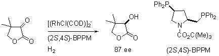 Chiral rhodium phosphine complexes with molecular hydrogen are effective catalysts for the hydrogenation of ketopantolactone with good enantioselectivity (Scheme 9).