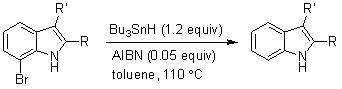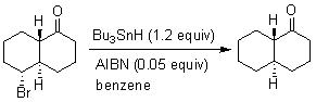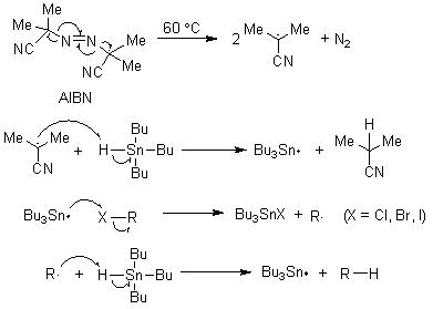 The halogens are removed by TBTH in presence of AIBN in aromatic hydrocarbon solvent such as benzene, toluene. The AIBN acts as a radical initiator and needed in catalytic amount (2-5 mol %). The reactivity order of the halogens is I > Br > Cl and F does not work under these conditions (Scheme 1-2).