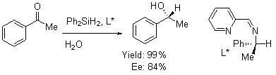 Asymmetric reduction involving silanes is possible when a chiral additive is used. For an example, acetophenone can be reduced to (R)-phenyl ethanol with good enantioselectivity in the presence of chiral ligand (Scheme 8).