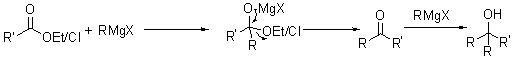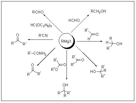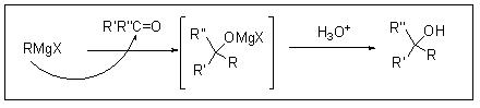 group of aldehydes, ketones, esters, anhydrides, acid chlorides and amides (Sheme 1). In these reactions, the alkyl, aryl or vinyl group having carbanionic character become attached to the carbonyl carbon and the magnesium halide to the oxygen of the carbonyl group to give a complex (addition product). These addition products on decomposition with proton source give the corresponding alcohols (Scheme 2).