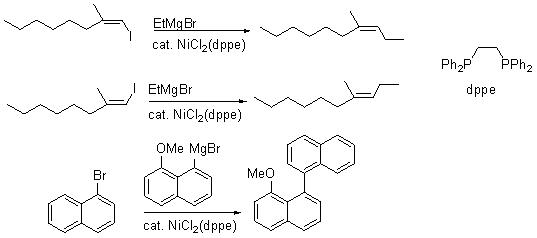 The coupling of alkenyl halides with organomagensium halides can be successfully carried out in the presence of NiCl2(dppe) in high yield. In these reactions the existing configuration of the stereogenic double bond is completely retained (Scheme 10). These reaction conditions are also compatible for the cross-coupling aryl halides/triflates with arylmagnesium halides.