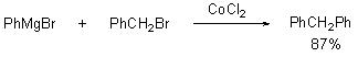 Alkyl, alkenyl as well as aryl triflates, bromides, and iodides can proceed substitution reactions with organomagnesium halides in the presence of transition metal catalysts. For examples, CoCl2 catalyzes the cross-coupling of phenylmagnesium bromide with benzyl bromide in 87% yield (Scheme 9) (Kharasch reaction).