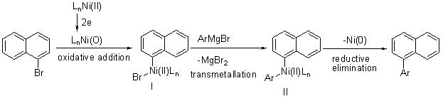 ArBr can undergo coordination with in situ generated Ni(0) complex that could lead to oxidative addition to give the intermediate I. The latter may undergo reaction with ArMgBr to replace the bromide to give the intermediate II (transmetallation) that could complete the catalytic cycle by reductive elimination of the target biaryl product.