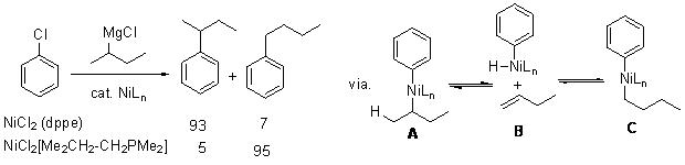 The C-C cross-coupling of secondary alkylmagnesium halide may occur in analogy to the reaction of the primary alkylmagnesium halide (Scheme 10), but they may also lead to the unexpected reactions depending on the catalytic system due to steric hindrance that could lead to isomeriazation of the C-C coupling (Scheme 11).
