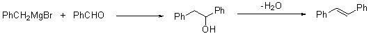 The synthesis of stilbene can be accomplished by the reaction of benzylmagnesium bromide with benzaldehyde, followed by dehydration (Scheme 13).