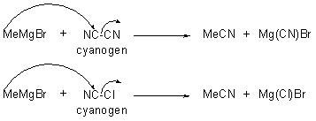 The reaction of alkylmagnesium halides with cyanogens or cyanogens chloride gives alkyl cyanides (Scheme 14).