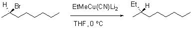 Higher order cuprates show greater reactivity compared Gilman reagents with alkyl halides, even secondary halides. For example, (S)-2-bromooctane reacts with EtMeCu(CN)Li at 0°C to give (R)-3-methylnonane in 72% yield (Scheme 12).