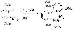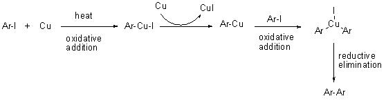 The coupling of aryl halides to afford biaryls using copper source is called Ullman reaction. The order of reactivity of aryl halides follows the order: ArI > ArBr > ArCl. Aromatic ring having electron withdrawing groups at ortho position activate, the ring towards coupling reaction. Unsymmetrical biaryls can be prepared by taking two different aryl halides (Scheme 1). The byproducts can be minimized when one aryl halide is very reactive and the other is relatively unreactive. The reaction takes place via oxidative addition followed by reductive elimination.