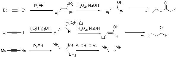 Alkynes on hydroboration with boranes give vinylboranes that could be readily transformed into a variety of synthetically useful compounds such as aldehydes, ketones or alkenes (Scheme 12). The reactivity and selectivity depend on the nature of organoboranes.