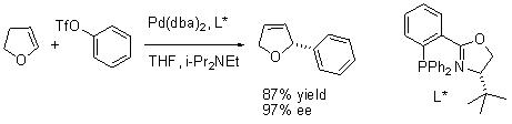 Asymmetric Heck reaction has been extensively studied. For an example, the Heck reaction of phenyl triflate with dihydrofuran has been accomplished using the amino acid-derived phosphine ligand with high enantioselectivity (Scheme 6).