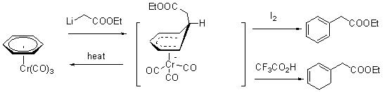 The arylchromiumtricarbonyl complex can also undergo nucleophilic aromatic substitution with carbon nucleophiles (Scheme 3). The mechanism involves the addition of nucleophile (R−) to the aromatic ring to generate a chromium stabilized carbanionic complex. The metal stabilized anion intermediate can be decomposed by reaction with iodine or by protonolysis to give substituted products. However, the addition of nucleophile can also be reversed on heating the carbonionic arylchromiumtricarbonyl complex.