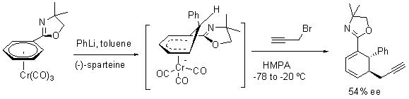 Asymmetric version of the reaction has been developed in the presence of chiral ligands. For an example, substituted arylchromiumtricarbonyl in the presence of (-)-sparteine undergoes reaction with PhLi, followed by propargyl bromide to give cyclohexadiene derivative in moderate enantioselectivity (Scheme 8).
