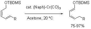 Arene-Cr(CO)3 is a good source for the generation of ‘free' Cr(CO)3 unit that catalyzes useful organic transformations. For examples, the selective 1,4-hydrogenation of 1,3-dienes give Z-configurated alkenes (Scheme 6). Only 1,3-dienes that can adopt a s-cisoid conformation is compatible, under these conditions isolated double bonds are not affected. While naphthalene-Cr(CO)3 complex catalyzes 1,5-hydrogenation.