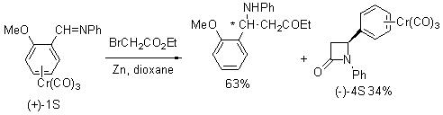 Arylchromiumtricarbonyl complexes have been employed in Zn-mediated Reformatzky-type alkylation reactions (Scheme 7). For an example, enantiomerically pure chromiumtricarbonyl complexes of benzaldimines react with bromoesters to afford stereoselectivly (ee > 98%) β -aminoesters and β -lactams (Scheme 7)