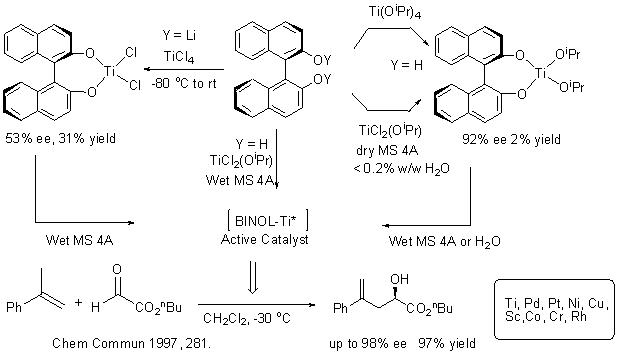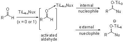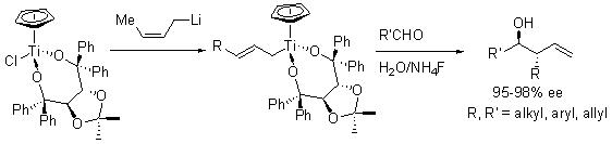 Titanium(IV)-mediated addition of nucleophiles to aldehydes exhibits excellent stereocontrol. The attacking nucleophile is either ligand of the activating titanium complex or an additional reagent. The stereoselectivity results from the bias of the titanium center (Scheme 2). For examples, asymmetric allylation of aldehydes and ‘ene' reactions mediated by chiral titanium complexes provide the corresponding homoallylic alcohols with excellent enantioselectivity (Scheme 3-4).