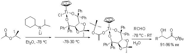 Similarly, aldol-type addition of enolates to aldehydes can be accomplished with excellent selectivity. For examples, the chiral cyclpentadienyltitanium complex derived from CpTiCl3 and TADDOL has been used for highly enantio- and diastereoselective aldol rections (Scheme 4). The products are obtained by transmetalating the Li-enolate with the Ti-TADDOL complex.