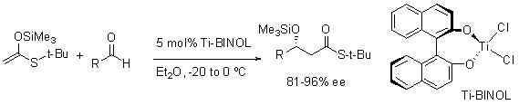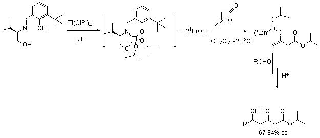 The addition of diketene to aldehydes can be accomplished using chiral titanium(IV) Schiff base complex to afford δ -hydroxy- β -ketoesters with reasonable enantioselectivity (Scheme 5). This reaction is too most probably proceeding via a Ti-enolate formed in situ from diketone and titanium(IV)-Schiff base complex. Catalytic version of this reaction can be carried out using Ti-BINOL complex. In this case a Mukaiyama-type aldol reaction between aldehydes and ketene silyl-acetal leads to provide silylated aldols with high optical purity (Scheme 6).