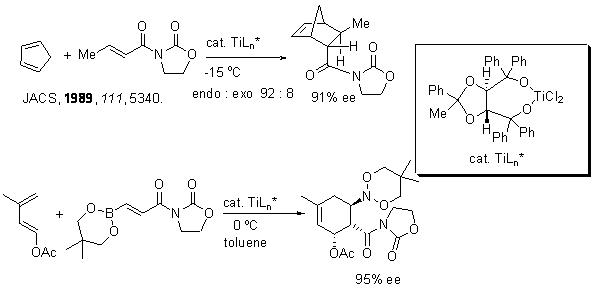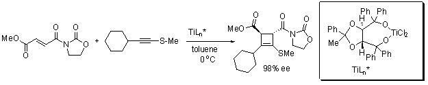 Chiral titanium(IV) complexes have been found to be excellent Lewis acid catalysts for cycloaddition reactions. For example, chiral titanium(IV) complex prepared from TADDOL and TiCl2 (OiPr)2 catalyzes Diels-Alder reactions of dienes with oxazolidinone derivatives of several α,β -unsaturated carboxylic acids with excellent optical purity (Scheme 9). These systems could also be used for [2+2]-cycloadditions between unsaturated N-acyl-oxazolidinones and electron-rich alkenes. For example, fumaryol derivative reacts with alkynyl sulfide to give cyclobutene derivative with excellent yield and enantioselectivity (Scheme 10).